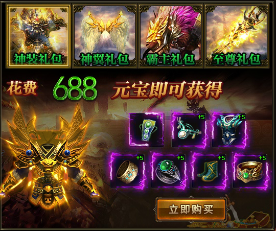 活动期间花费少量元宝,即可购买四大豪华礼包,豪华套装、翅膀直升丹、坐骑直升丹、至尊武器等你来拿