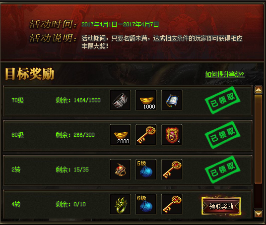 活动期间,玩家等级提升达到目标等级,及可领取等级竞技的丰厚奖励