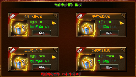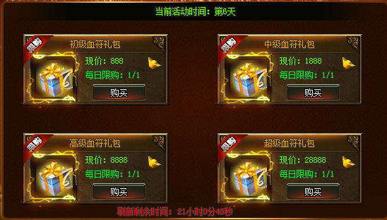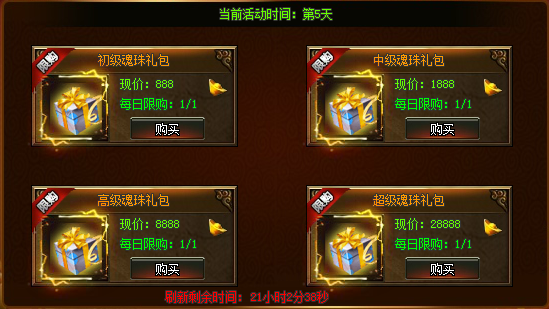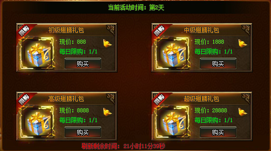 七日购买里面的礼包内容每日一换,每天都不同。出售开服竞技中的不同的竞技所需消耗的道具礼包