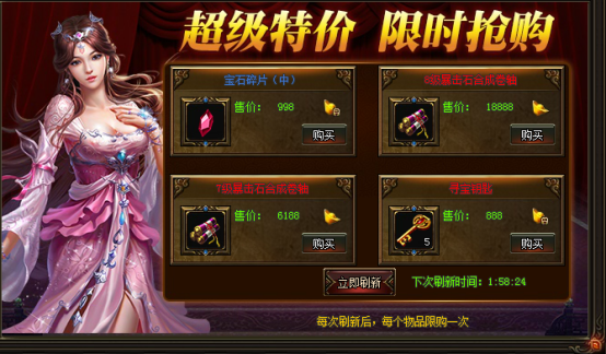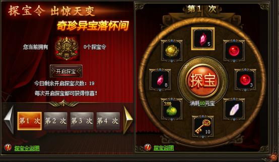 活动期间,玩家可通过击杀BOSS或参加活动获得探宝令。消耗探宝令可以开启神秘探宝,消耗少量元宝即可获得超值极品道具。探宝每天0:00清空重置。