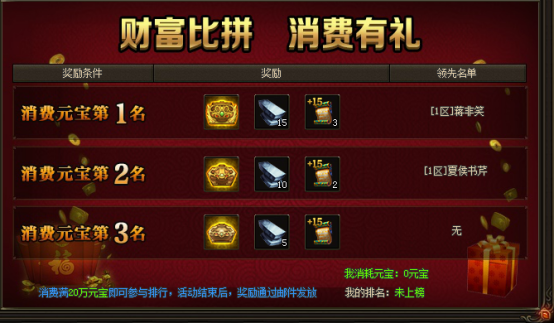 活动期间,玩家累计消费达20万元宝即可参与排名。上榜玩家即可获得极品灵石盒,黑晶以及+15强化卷轴。