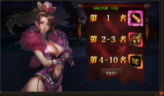 活动期间,玩家累计充值排行,与全平台玩家同场较量。第一名玩家可获得飞升武器!第2-3名玩家可获得飞升衣服,4-10名玩家可获得飞升防具箱