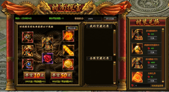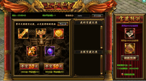 上古寻宝中可以获得大量极品道具。更有宝藏预测。在上古寻宝中的寻宝次数累计达成目标,即可额外获得一份超值大奖!奖励多多,选择多多。