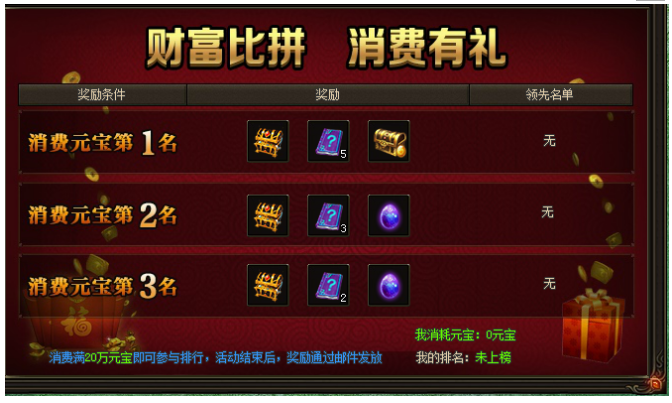 活动期间,玩家累计消费达20万元宝即可参与排名。上榜玩家即可获得热血装备箱,强化技能书以及战宠蛋,第1名更可额外获得“财源滚滚”称号。