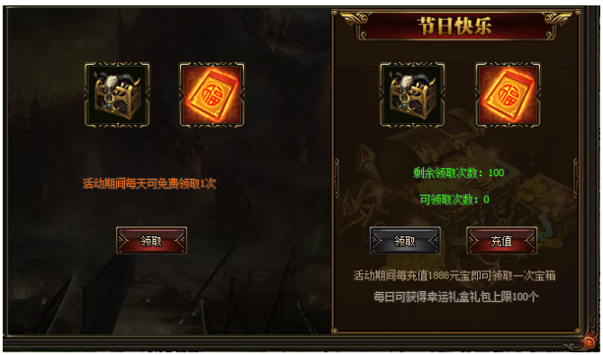 活动期间,登录即可领取幸运礼盒和庆典礼券。同时,每充值1888元宝即可领取一次幸运礼盒和庆典礼券,每天限100次领取。