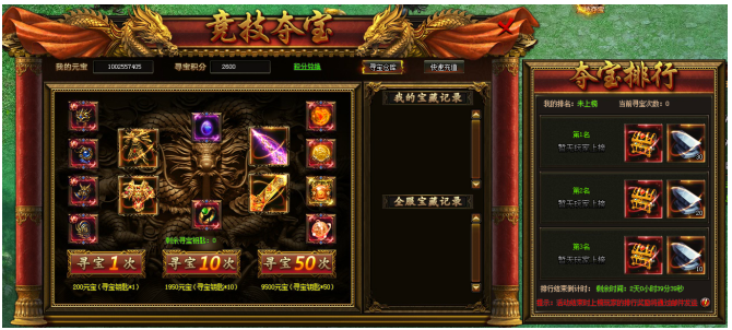 竞技夺宝中可以获得大量极品道具。活动期间,寻宝次数累计,在活动结束时进行比拼排行。前三名玩家可以获得超值珍稀道具!