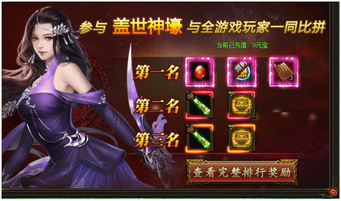 活动期间,玩家累计充值排行,与全游戏玩家同场较量。第一名玩家可获得完美的战宠蛋——齐天大圣,限时称号——盖世神壕,以及齐天大圣的主动技能书——神威震天!第2-3名玩家可获得绝·飞升武器以及高级灵石箱,4-5名玩家可获得绝·飞升衣服以及高级灵石箱。更多排行奖励请在游戏内查看。