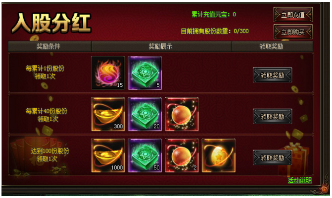 活动期间,玩家达成条件即可购买股份。购买的股份越多可领取的奖励越多。超极限奖励,不容错过!