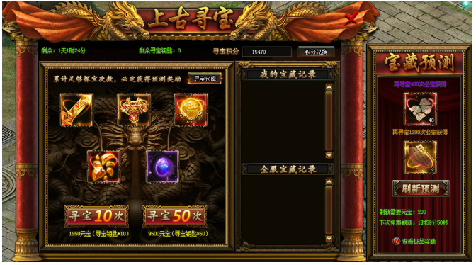 上古寻宝中可以获得大量极品道具。更有宝藏预测。在上古寻宝中的寻宝次数累计达成目标,即可额外获得一份超值大奖!奖励多多,选择多多。