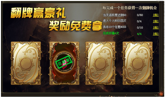 活动期间,玩家每天达成一定条件即可获得一次幸运翻牌的机会。翻牌即可免费获得超值奖励!