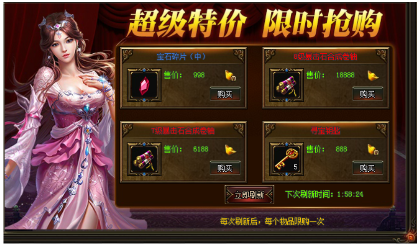 活动期间,玩家可在神秘商店中获得各种珍稀道具,甚至是绝无仅有的稀世奇珍。神秘商店每隔一段时间会刷新一次。刷新后会出现新的道具,每组道具仅能购买一次,直到下次刷新