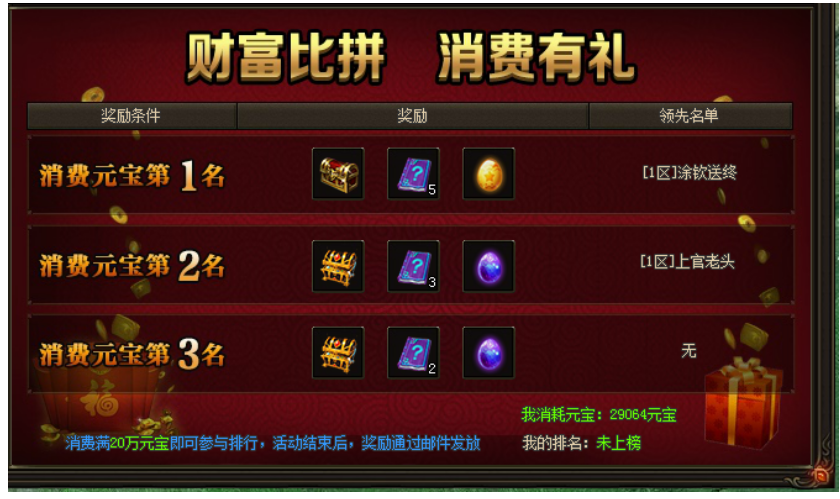 活动期间,玩家累计消费达20万元宝即可参与排名。上榜玩家即可获得热血装备箱,强化技能书以及战宠蛋。