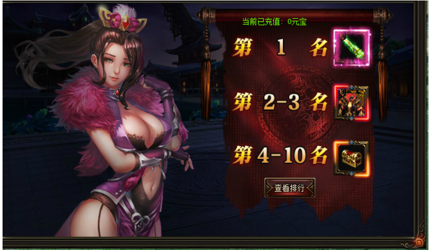 活动期间,玩家累计充值排行,与全平台玩家同场较量。第一名玩家可获得飞升武器!第2-3名玩家可获得飞升衣服,4-10名玩家可获得飞升防具箱