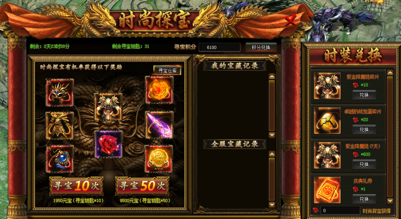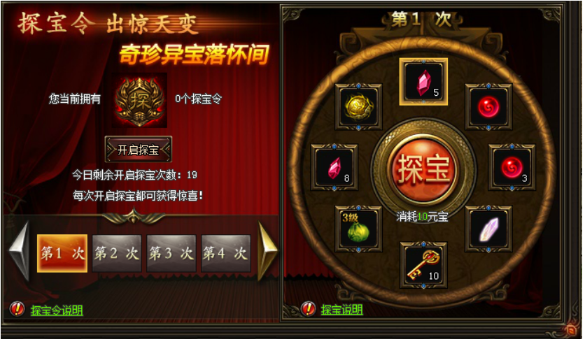 活动期间,玩家可通过击杀BOSS或参加活动获得探宝令。消耗探宝令可以开启神秘探宝,消耗少量元宝即可获得超值极品道具。探宝每天0:00清空重置。