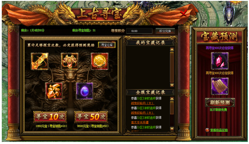上古寻宝中可以获得大量极品道具。更有宝藏预测。在上古寻宝中的寻宝次数累计达成目标,即可额外获得一份超值大奖!奖励多多,选择多多。