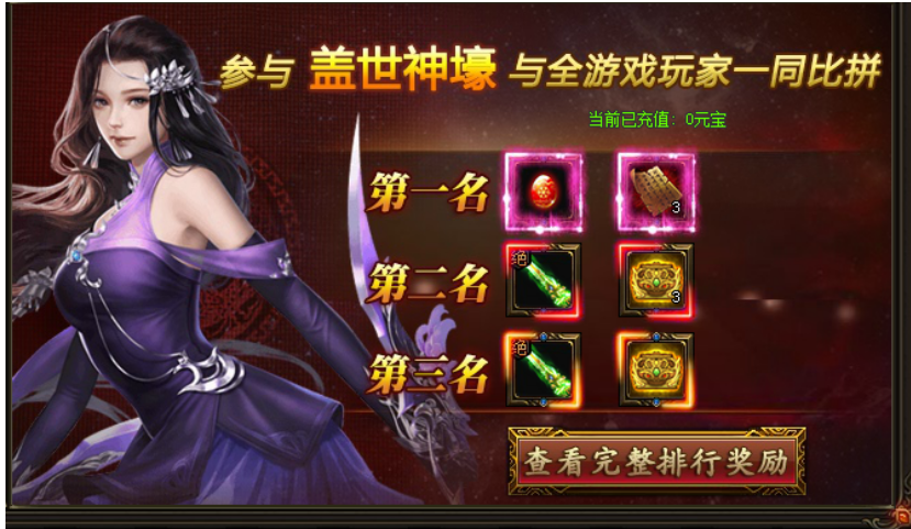 活动期间,玩家累计充值排行,与全游戏玩家同场较量。第一名玩家可获得完美的战宠蛋(齐天大圣)以及完美的战宠——齐天大圣的主动技能书——神威震天!第2-3名玩家可获得绝·飞升武器以及高级灵石箱,4-5名玩家可获得绝·飞升衣服以及高级灵石箱。更多排行奖励请在游戏内查看。