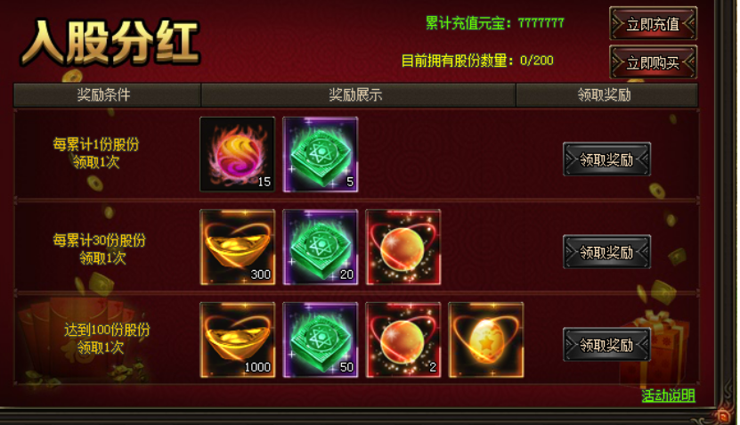 活动期间,玩家达成条件即可购买股份。购买的股份越多可领取的奖励越多。超极限奖励,不容错过!