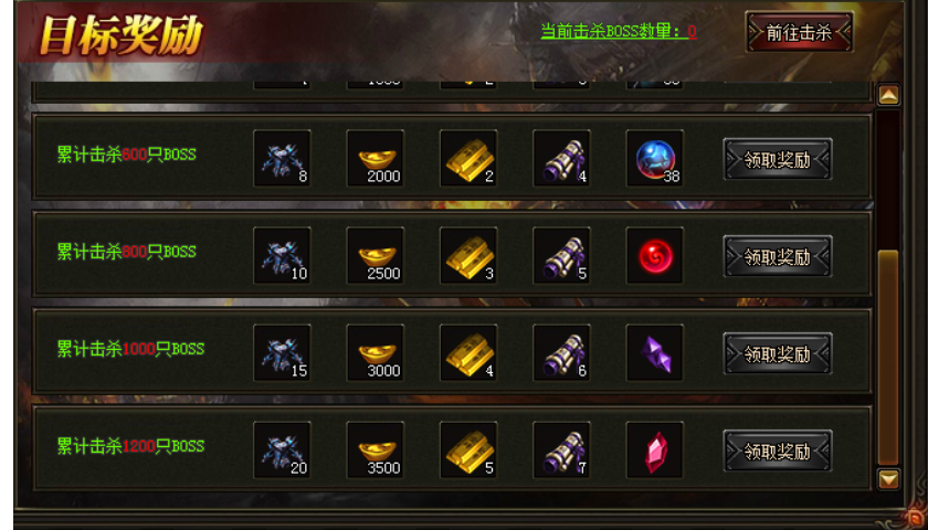 活动期间,玩家累计击杀BOSS的数量达到目标,即可领取大量奖励!