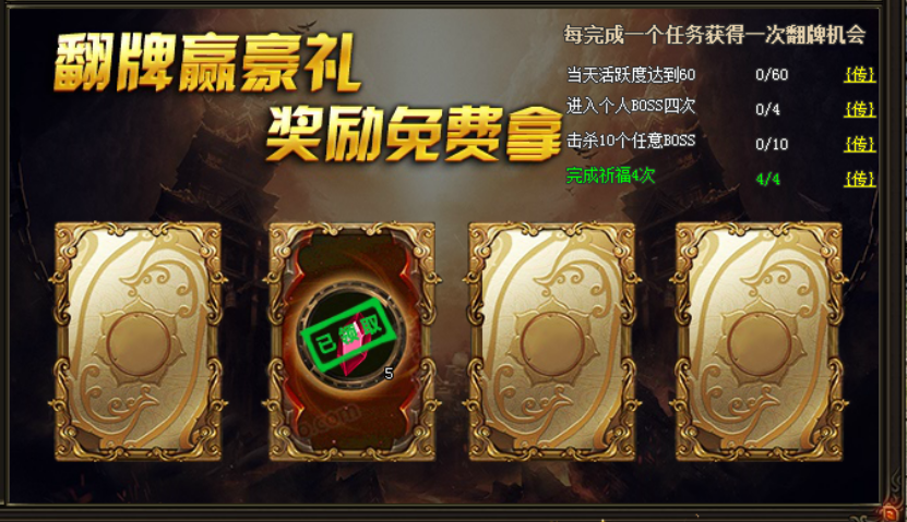 活动期间,玩家每天达成一定条件即可获得一次幸运翻牌的机会。翻牌即可免费获得超值奖励!