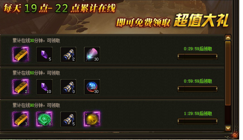 活动期间,玩家每日在固定时间段内登录游戏,累计在线时间,即可领取大量奖励!