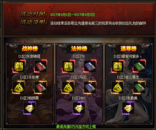 活动结束后各职业的充值排名前三的玩家将会收到对应奖励的邮件
