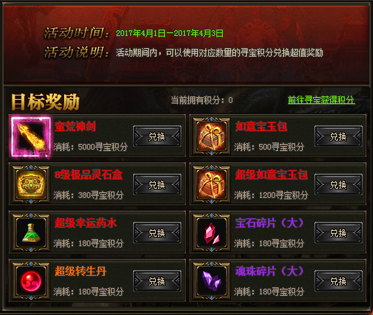 活动期间玩家可以通过寻宝获得的积分在此处兑换超值奖励