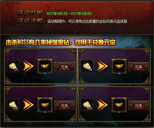 活动期间,玩家击杀BOSS有几率掉落金钻,使用对应数量的金钻可兑换元宝奖励
