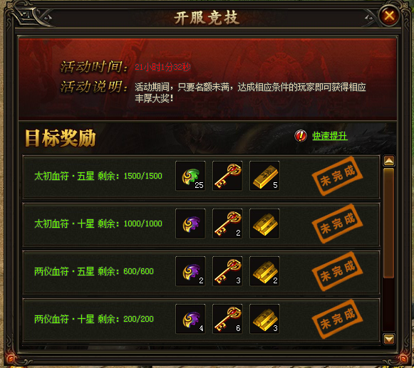 开服竞技活动分为七项为期7天,每天开启一个竞技活动。分别为坐骑竞技、翅膀竞技、等级竞技、宝石竞技、魂珠竞技、血符竞技和护盾竞技