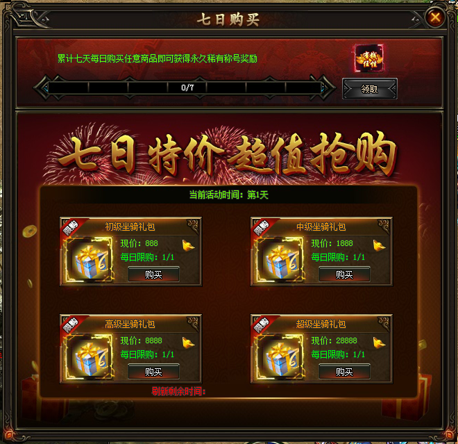 活动期间,在七日购买界面累计七天每日购买任意商品即可获得永久稀有称号奖励
