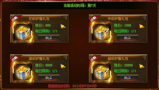 七日购买里面的礼包内容每日一换,每天都不同。出售开服竞技中的不同的竞技所需消耗的道具礼包