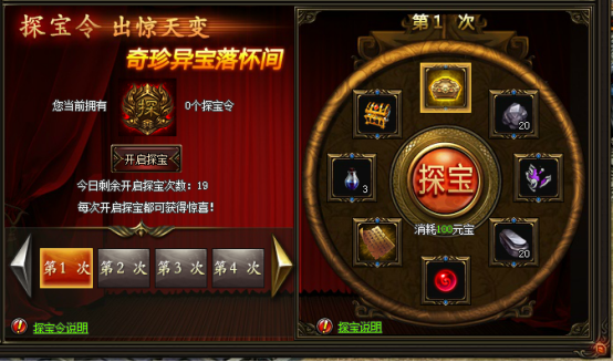 活动期间,玩家可通过击杀BOSS或参加活动获得探宝令。消耗探宝令可以开启神秘探宝,消耗少量元宝即可获得超值极品道具。探宝每天0:00清空重置。