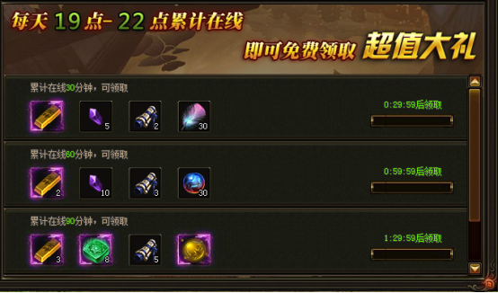 活动期间,玩家每日在固定时间段内登录游戏,累计在线时间,即可领取大量奖励!