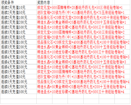 累计充值2000元宝,可领取: 进阶宝箱*5秘籍典藏*1双倍经验卷轴*1绑定元宝*1000 |