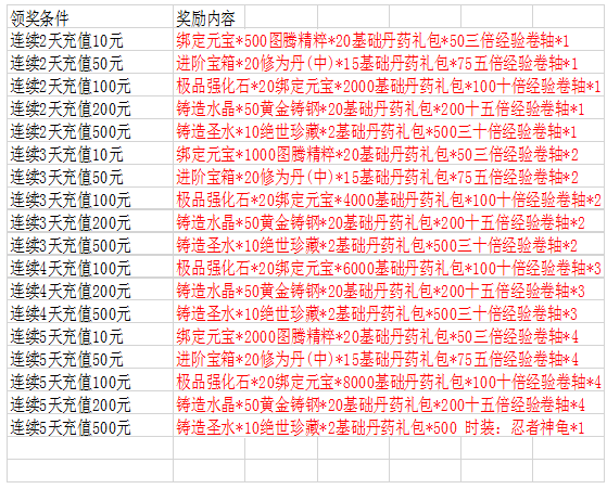 累计充值4000元宝,可领取: 进阶宝箱*10秘籍典藏*2力量套装石*3三倍经验卷轴*1绑定元宝*2000 |