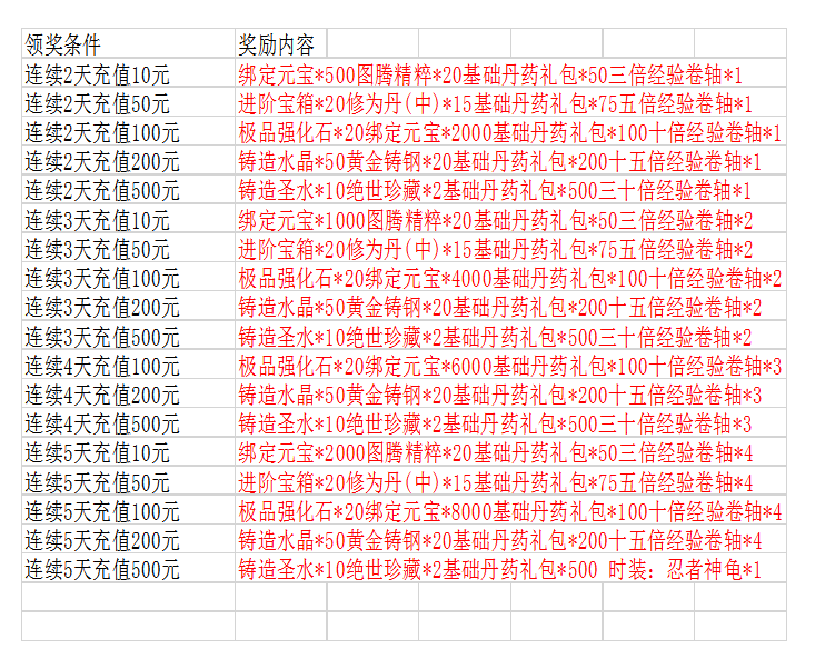 累计充值2000元宝,可领取: 进阶宝箱*5秘籍典藏*1双倍经验卷轴*1绑定元宝*1000 |