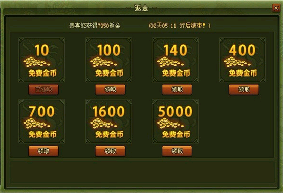 活动期间,累积充值即可获得高额金币返利,充越多返越多;
