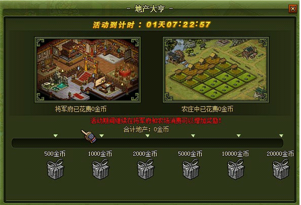 1、活动只计算活期间强化农民星级、开启将军府、农田、牧场、矿场、马匹养殖位花费的金币