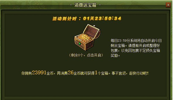 活动时间&活动范围: (12月4日00:00~23:59 12月2日当天及之后开启的服务器不参与) 建议活动结束前开启所有宝箱 活动规则: 1、消费提示数量的金币即可获得宝箱 2、 开启宝箱可获得银币、宝石、菜肴 3、 奖励有1倍、2倍、4倍、10倍奖励暴击 4、活动结束后系统将自动开启未开启的宝箱,背包满的:获得的宝石、菜肴将消失.