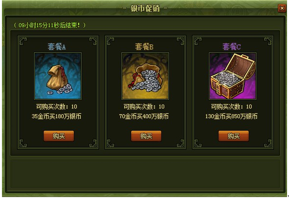 活动开启后点击活动按钮即可打开页面直接购买银币