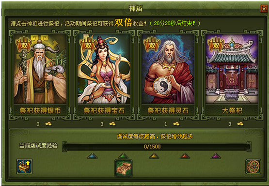 祭祀银币、宝石、灵石收益翻倍。