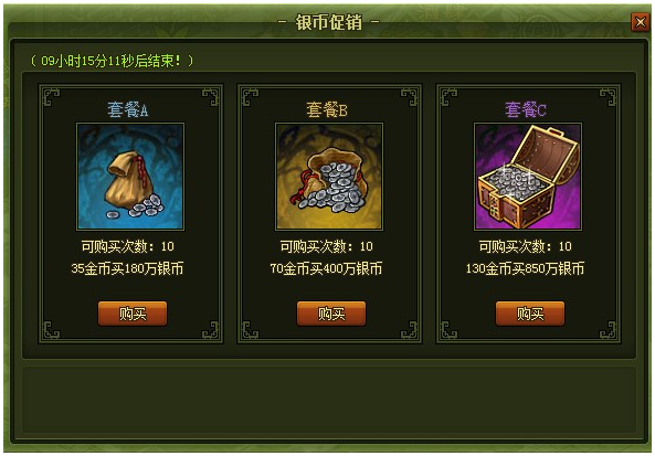 活动开启后点击活动按钮即可打开页面直接购买银币
