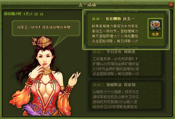 活动期间玩家每天可免费领取小鸡炖蘑菇*15,并可使用金币购买更多菜肴。