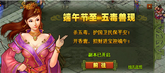 每日21点举行五毒兽活动,活动开启后,进入可用金币购买爆竹,使用爆竹或攻击五毒兽可获得香囊、击杀五毒兽的玩家可额外活动50香囊奖励,参与击杀五毒兽的玩家根据伤害的排行开启不同数量的宝箱。