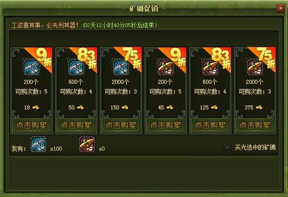 活动开启后点击活动按钮即可打开页面直接购买银矿锄或金矿锄。
