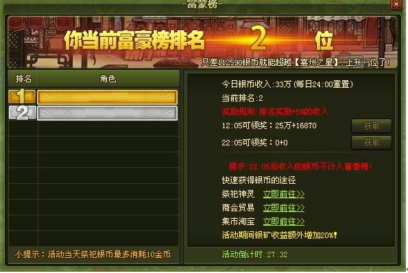 2、 每日12:05,22:05可领取活动银币奖励,奖励=排名奖励+5%当日银币收入;