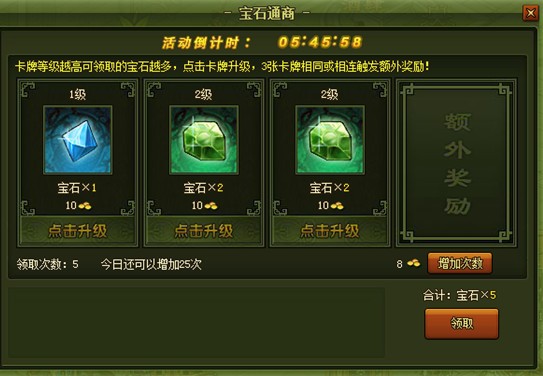 3、可使用金币升级卡牌,3张同等级卡牌或相连时领取时可获得额外特殊奖励。