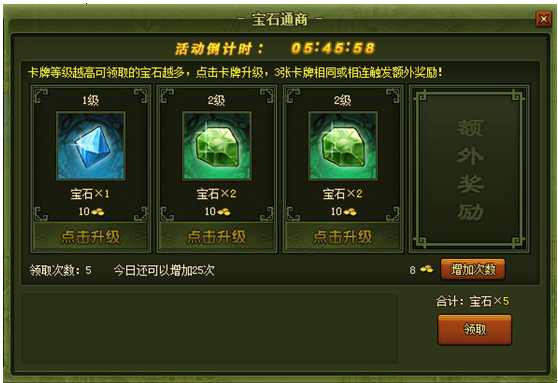 3、可使用金币升级卡牌,3张同等级卡牌或相连时领取时可获得额外特殊奖励。