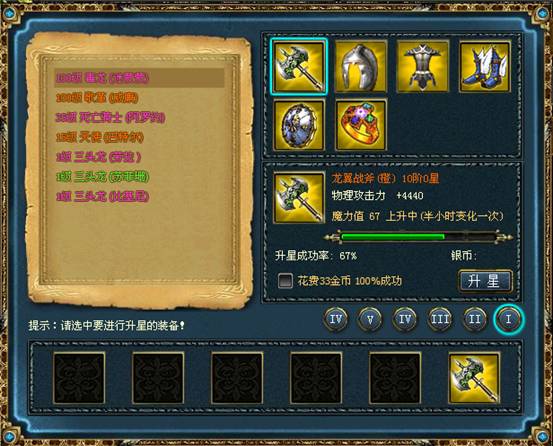 玩家可以通过各主城“商店”提供的“升星强化”功能对首领、英雄的装备进行强化。同等级装备强化,高阶品质装备消耗的银币数额要高于低阶品质装备。
