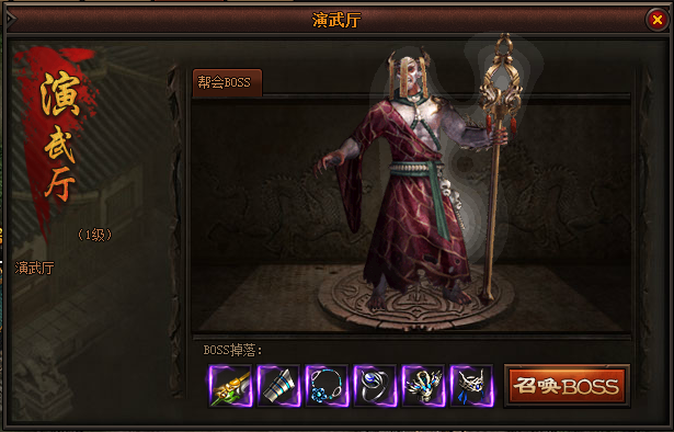 演武厅:帮会BOSS与领地BOSS召唤,击杀BOSS获得帮贡与掉落奖励;
