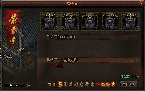 荣誉堂:升级聚义堂的帮会旗帜与个人勋章,可以为玩家提供一定的属性加成;帮会荣誉与个人战功可在沙城战、领地战与帮会宣战中获得
